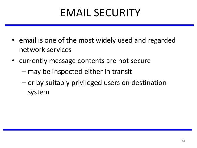 Electronic mail security E-mail security issues. By Adesh Rampat. unfortunately, it is not the safest and most reliable. Virus-infected e-mails and wiretapping on network lines are the main reasons that affect the reliability of e-mail. Encrypting . Electronic mail security ... Get Document